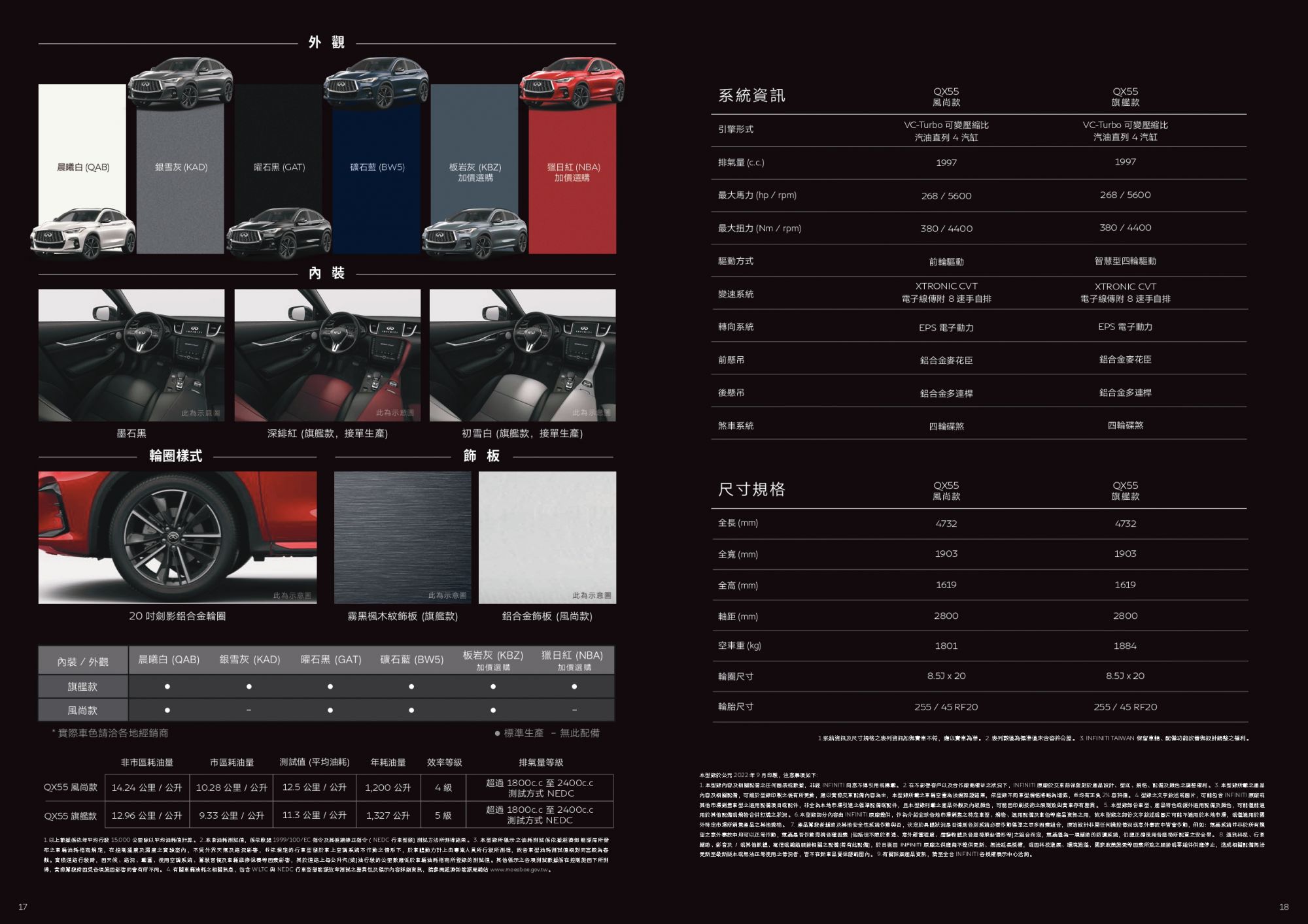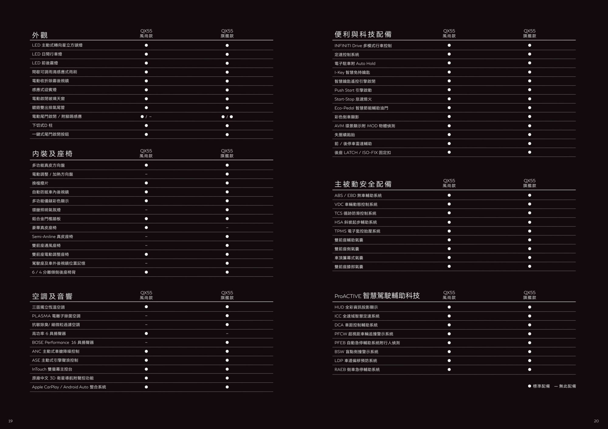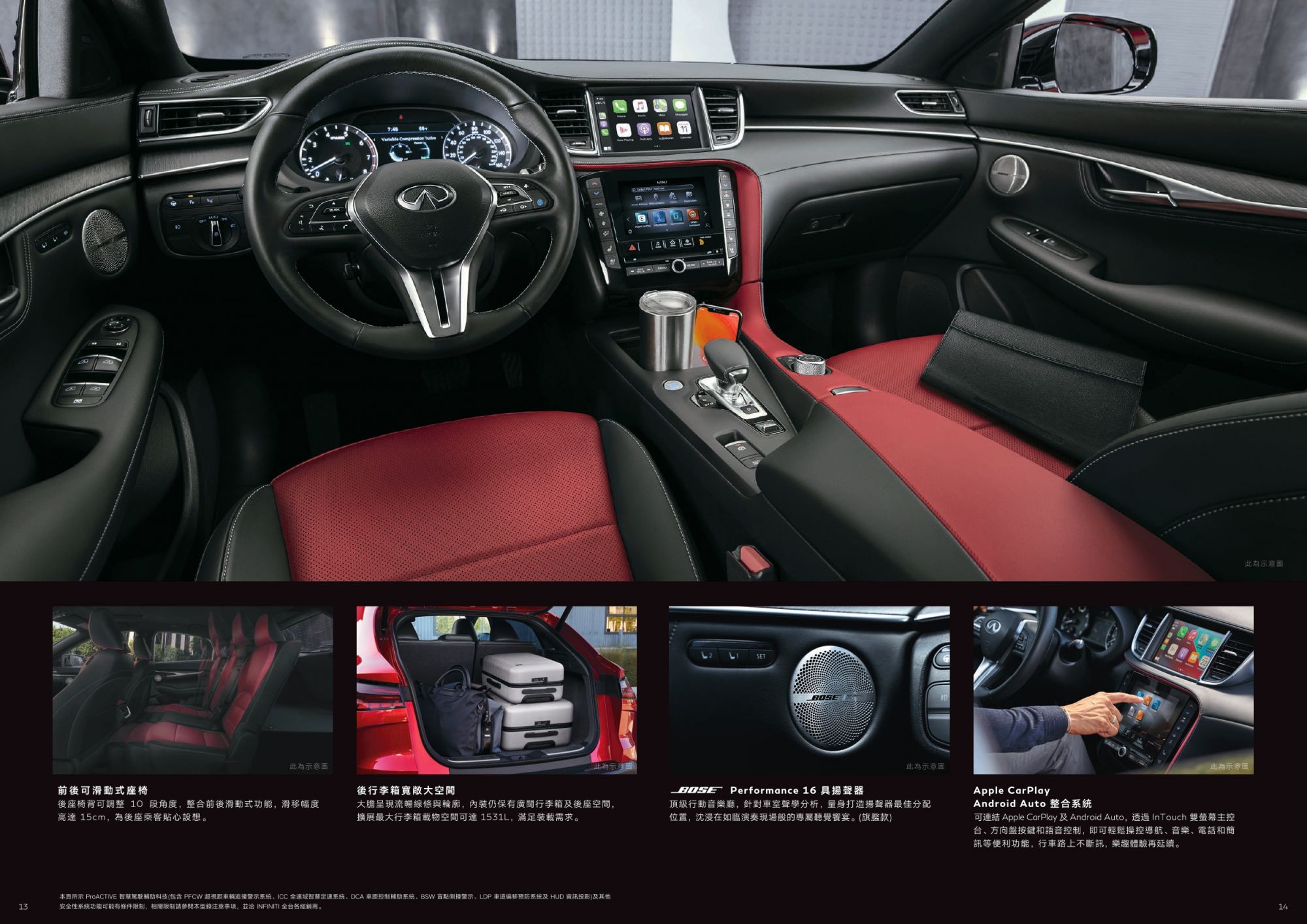 風尚款/222.5萬●2.0t VC-Turbo 可變壓縮比引擎●20 吋鋁合金輪圈●LED 數位琴鍵尾燈●日式摺紙格柵●電動尾門啟閉●ProACTIVE 智慧駕駛科技旗艦款/255萬●2.0t VC-Turbo 可變壓縮比引擎●20 吋鋁合金輪圈●LED 數位琴鍵尾燈●日式摺紙格柵●BOSE Performance 16 具揚聲器●ProACTIVE 智慧駕駛科技